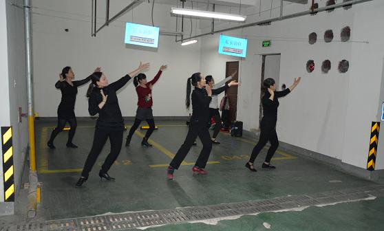 鼎盛國(guó)際員工在地下車(chē)庫(kù)認(rèn)真排練店慶節(jié)目