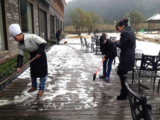 為了保證顧客和員工出入安全,酒店于22上午組織員工掃雪。盡管天氣寒冷,但全體職工熱情高漲、干勁十足,大家團結合作,在短短2個小時內已將酒店門前后院的積雪清理干凈。