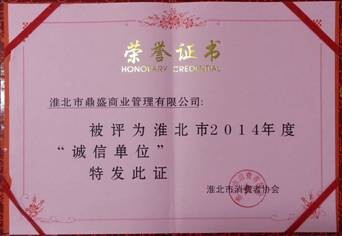 鼎盛國(guó)際購(gòu)物中心在2014年經(jīng)營(yíng)中,因堅(jiān)持誠(chéng)實(shí)守信、誠(chéng)信經(jīng)營(yíng),被淮北市消費(fèi)者協(xié)會(huì)評(píng)為淮北市2014年度“誠(chéng)信單位”。