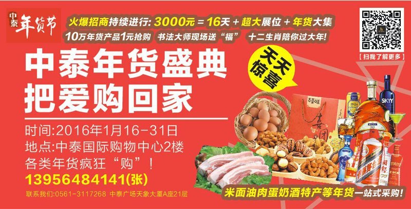 淮北中泰年貨節(jié)時間:2016年1月16日—31日,為期十六天。地點:淮北中泰國際廣場(中泰淘寶街)。參展種類:特色農產品及特色食品、糖酒/茶及飲料、民俗文化商品、服裝家紡、家電家居、汽車等。