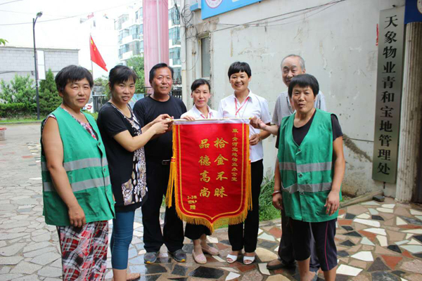 8月2日,淮北天象物業管理公司保潔員祝道俠和任翠萍像往常一樣在清理小區垃圾時,撿到一個皮包,打開一看里面裝有一萬多元,她們意識到這包應該是業主不小心遺失的,于是趕緊向物業公司領導匯報,希望可以及時聯系上業主。物業公司立即通過走訪詢問找到了失主,失主喜極于泣,感激萬分!事后,業主將一面寫有“拾金不昧,品德高尚”八個大字的錦旗、水和糖送到了小區物業管理處,還燃放了兩掛鞭炮,對祝道俠和任翠萍兩名同志拾金不昧的義舉表示感謝。